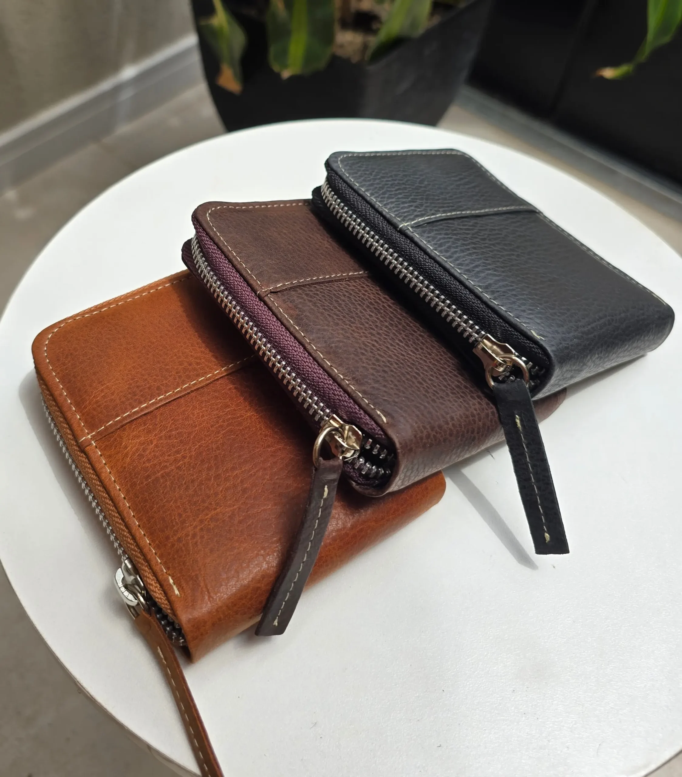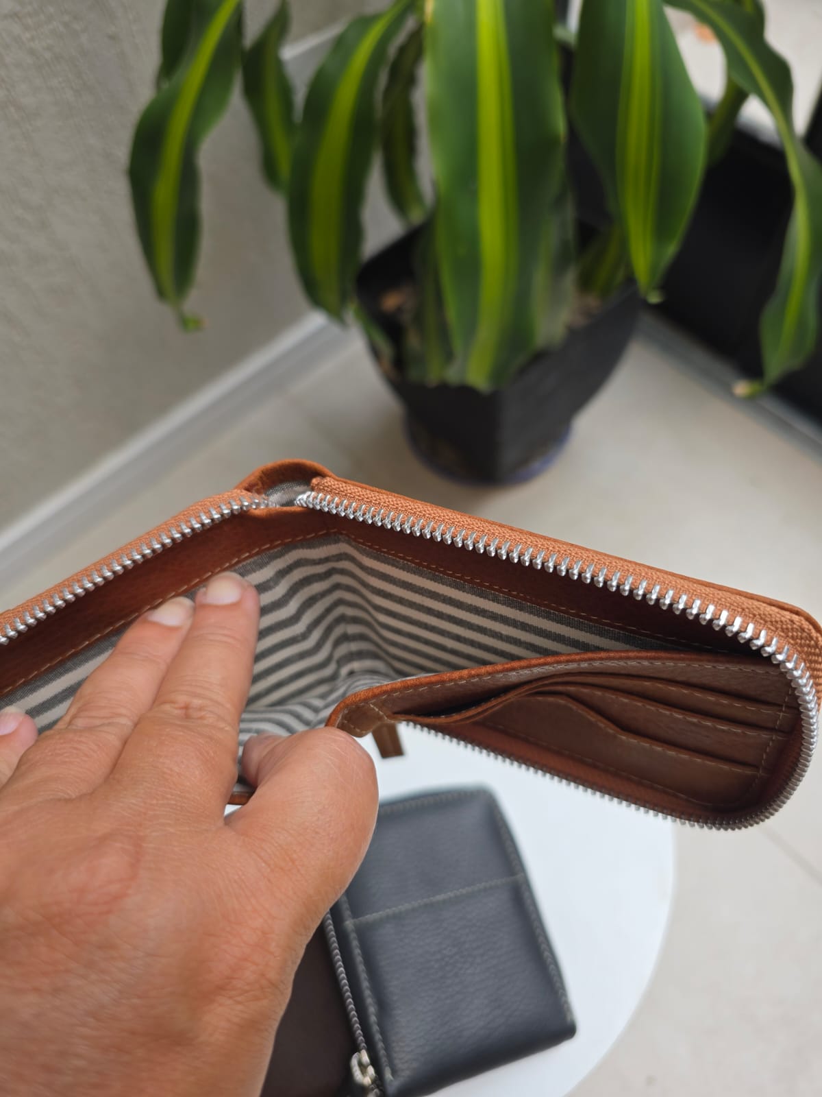 El interior cuenta con compartimentos para billetes y divisiones para tarjetas.