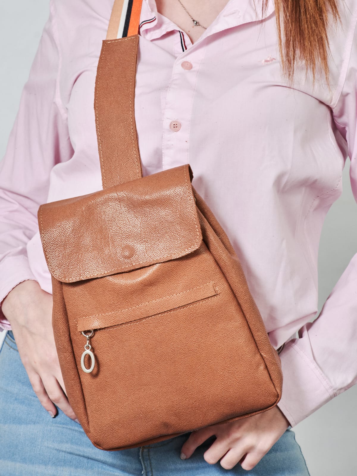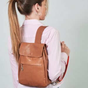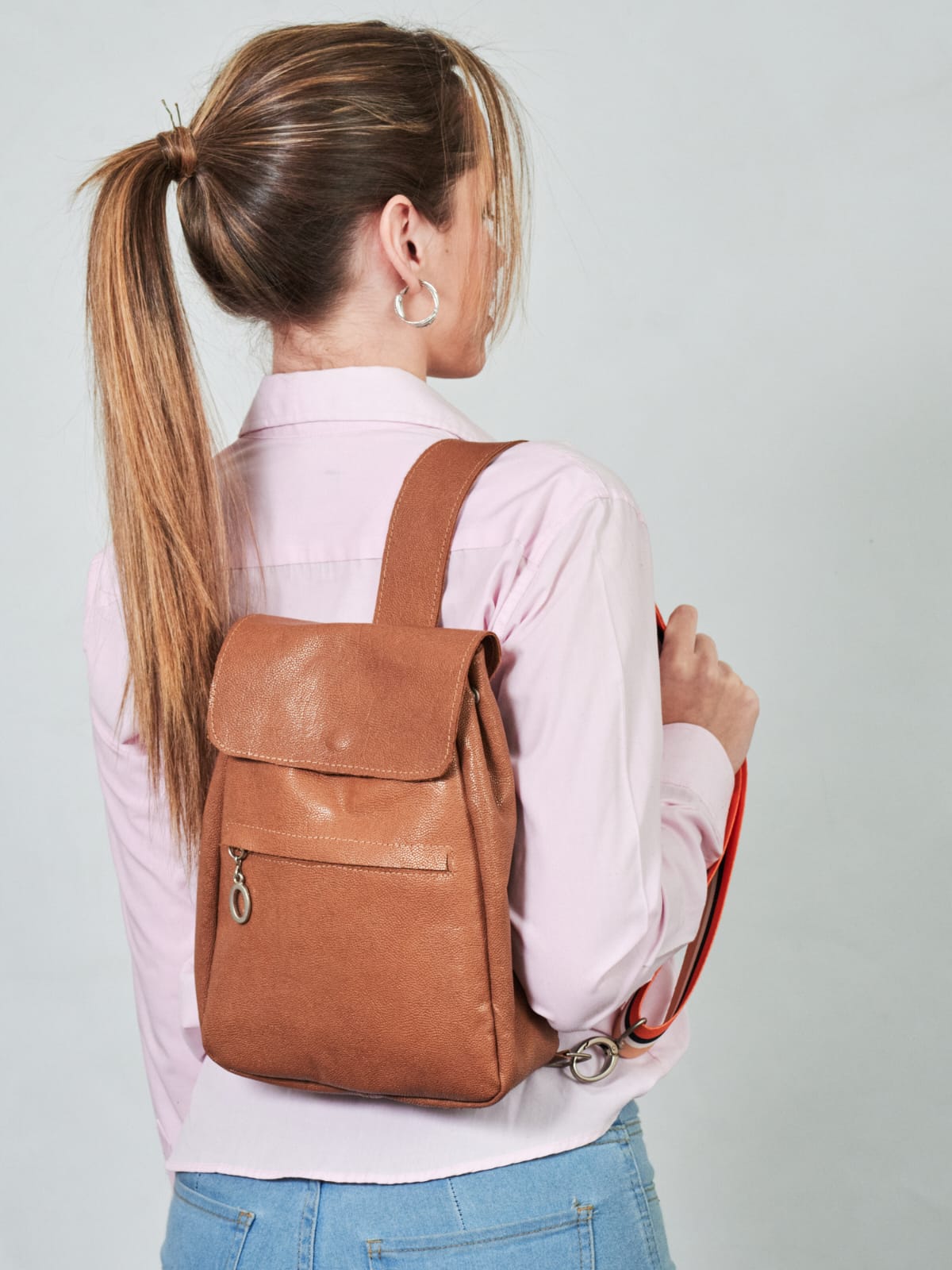 Mochila tamaño mediano, confeccionada en cuero vacuno.